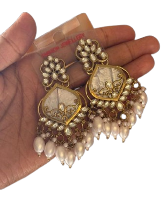 Step into timeless elegance with these exquisite Kundan Pearl Drop Earrings, crafted to reflect royal charm and delicate craftsmanship. Featuring a graceful teardrop-shaped kundan centerpiece framed in a rich gold-tone finish, these earrings are adorned with sparkling stones and finished with cascading soft pearl drops for a luxurious look.
